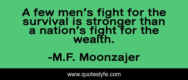 This page presents the quote "A few men’s fight for the survival is stronger than a nation’s fight for the wealth.". Author of this quote is M.F. Moonzajer. This quote is about wealth, survival, men, stronger, fight, nation,.