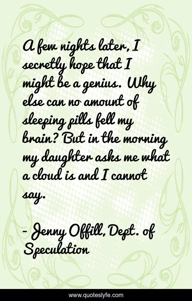 This page presents the quote "A few nights later, I secretly hope that I might be a genius. Why else can no amount of sleeping pills fell my brain? But in the morning my daughter asks me what a cloud is and I cannot say.". Author of this quote is Jenny Offill, Dept. of Speculation. This quote is about clouds, knowledge, genius, sleepless, sleeping, brain, sleeplessness, sleep,.