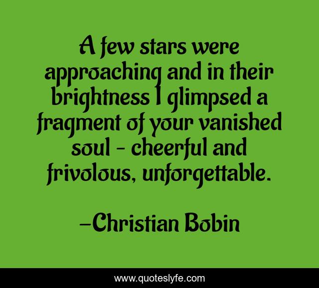This page presents the quote "A few stars were approaching and in their brightness I glimpsed a fragment of your vanished soul – cheerful and frivolous, unforgettable.". Author of this quote is Christian Bobin. This quote is about cheerful, vanished-soul, frivolous, stars,.