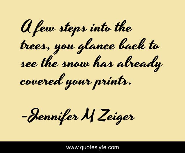 This page presents the quote "A few steps into the trees, you glance back to see the snow has already covered your prints.". Author of this quote is Jennifer M Zeiger. This quote is about fantasy, adventure, the-adventure,.