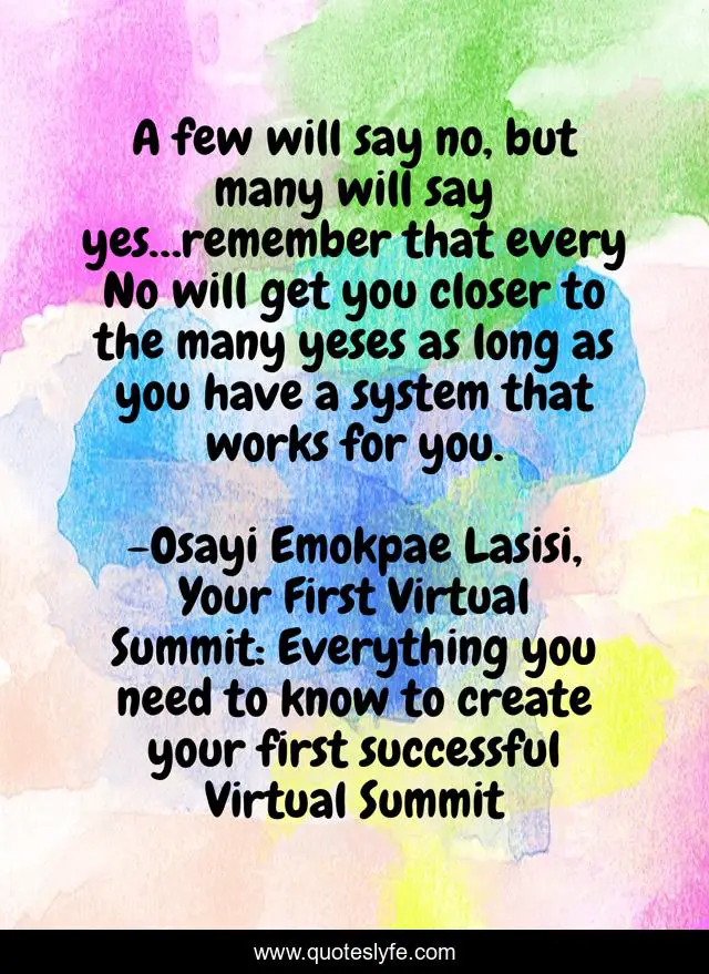 This page presents the quote "A few will say no, but many will say yes…remember that every No will get you closer to the many yeses as long as you have a system that works for you.". Author of this quote is Osayi Emokpae Lasisi, Your First Virtual Summit: Everything you need to know to create your first successful Virtual Summit. This quote is about speakers, business, no, virtual-summit, online, yes, events,.