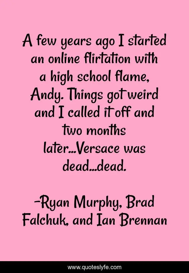 This page presents the quote "A few years ago I started an online flirtation with a high school flame, Andy. Things got weird and I called it off and two months later...Versace was dead...dead.". Author of this quote is Ryan Murphy, Brad Falchuk, and Ian Brennan. This quote is about fashion, andrew-cunanan, versacen, glee, versace, internet, crime, emma-pillsbury, murder,.