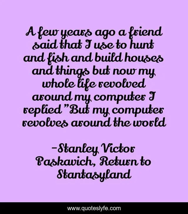 This page presents the quote "A few years ago a friend said that I use to hunt and fish and build houses and things but now my whole life revolved around my computer I replied "But my computer revolves around the world". Author of this quote is Stanley Victor Paskavich, Return to Stantasyland. This quote is about computer-science, computers, stantasyland, internet,.