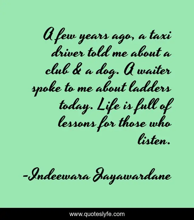 This page presents the quote "A few years ago, a taxi driver told me about a club & a dog. A waiter spoke to me about ladders today. Life is full of lessons for those who listen.". Author of this quote is Indeewara Jayawardane. This quote is about lessons, lesson, life, listening, listen,.