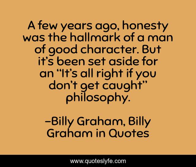 This page presents the quote "A few years ago, honesty was the hallmark of a man of good character. But it’s been set aside for an “It’s all right if you don’t get caught” philosophy.". Author of this quote is Billy Graham, Billy Graham in Quotes. This quote is about character, billy-graham,.