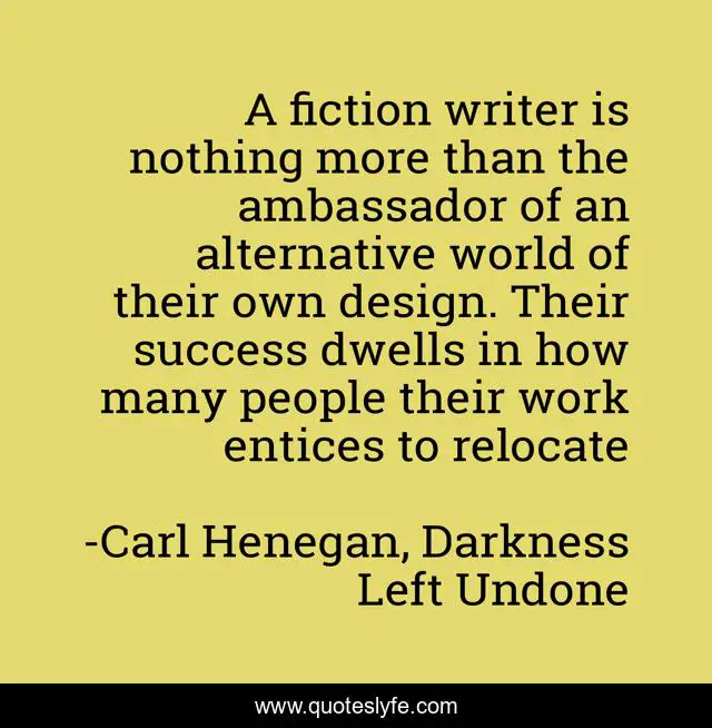 This page presents the quote "A fiction writer is nothing more than the ambassador of an alternative world of their own design. Their success dwells in how many people their work entices to relocate". Author of this quote is Carl Henegan, Darkness Left Undone. This quote is about ambassador, writer, success, fiction,.