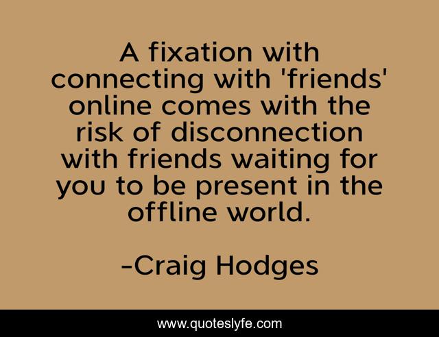 This page presents the quote "A fixation with connecting with 'friends' online comes with the risk of disconnection with friends waiting for you to be present in the offline world.". Author of this quote is Craig Hodges. This quote is about disconnection, connection, friends, social-media, internet,.