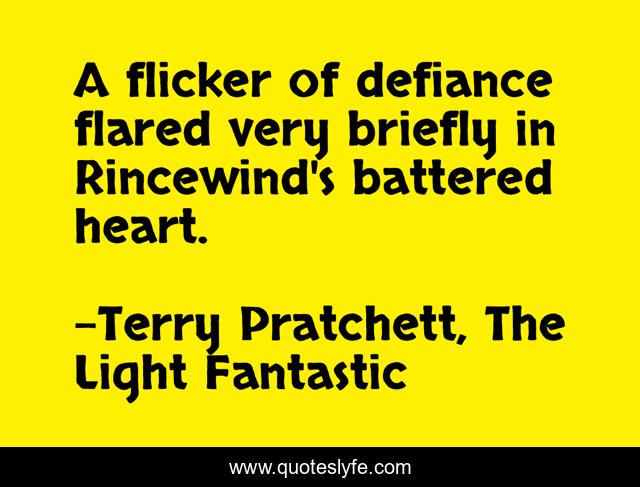 This page presents the quote "A flicker of defiance flared very briefly in Rincewind's battered heart.". Author of this quote is Terry Pratchett, The Light Fantastic. This quote is about rincewind, heart, defiance,.