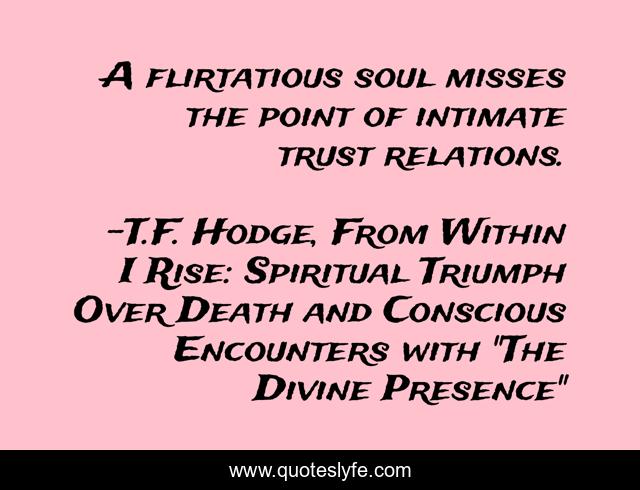 This page presents the quote "A flirtatious soul misses the point of intimate trust relations.". Author of this quote is T.F. Hodge, From Within I Rise: Spiritual Triumph Over Death and Conscious Encounters with "The Divine Presence". This quote is about relationship, intimate, flirting, flirtatious, relations, tease, flirt, person, teaser,.