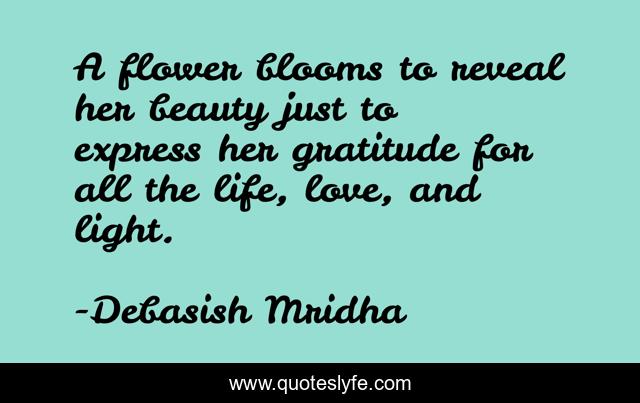 This page presents the quote "A flower blooms to reveal her beauty just to express her gratitude for all the life, love, and light.". Author of this quote is Debasish Mridha. This quote is about gratitude, love, beauty, light, philosophy, debasish-mridha, quotes, inspirational, gratitude-for-life,.