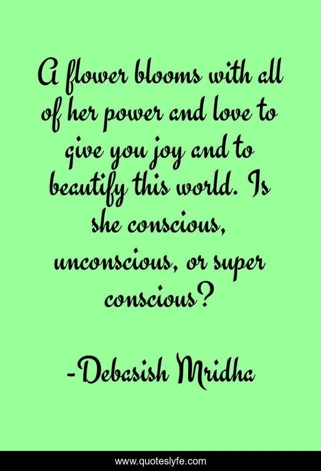 This page presents the quote "A flower blooms with all of her power and love to give you joy and to beautify this world. Is she conscious, unconscious, or super conscious?". Author of this quote is Debasish Mridha. This quote is about unconscious, consciousness, joy, philosophy, debasish-mridha, quotes, beautify-this-world, inspirational, enthusiasm,.