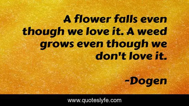 This page presents the quote "A flower falls even though we love it. A weed grows even though we don't love it.". Author of this quote is Dogen. .