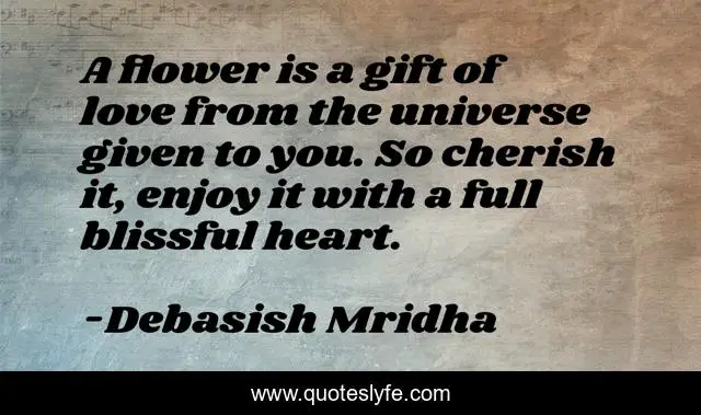This page presents the quote "A flower is a gift of love from the universe given to you. So cherish it, enjoy it with a full blissful heart.". Author of this quote is Debasish Mridha. This quote is about blissful-heart, love, gift-of-love, philosophy, debasish-mridha, valentine, quotes, bliss, inspirational,.
