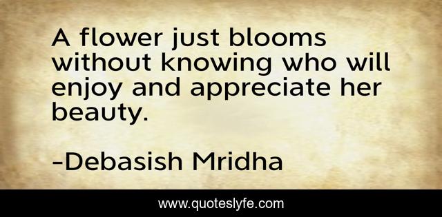 This page presents the quote "A flower just blooms without knowing who will enjoy and appreciate her beauty.". Author of this quote is Debasish Mridha. This quote is about beauty, philosophy, debasish-mridha, quotes, appreciate-beauty, inspirational, enthusiasm, enjoy-beauty, debasish-mridha-m-d,.
