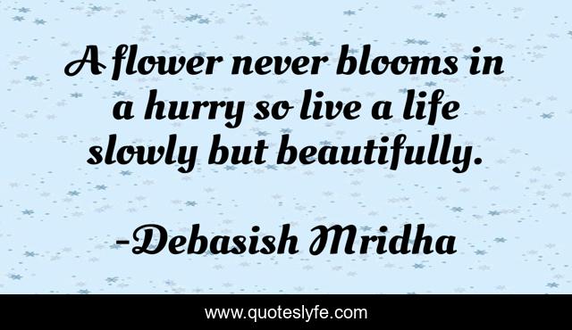 This page presents the quote "A flower never blooms in a hurry so live a life slowly but beautifully.". Author of this quote is Debasish Mridha. This quote is about life, love, knowledge, inspirational, intelligence, philosophy, wisdom, quotes, affection,.