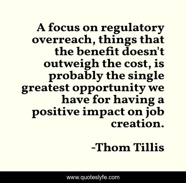 This page presents the quote "A focus on regulatory overreach, things that the benefit doesn't outweigh the cost, is probably the single greatest opportunity we have for having a positive impact on job creation.". Author of this quote is Thom Tillis. This quote is about job, opportunity, focus,.