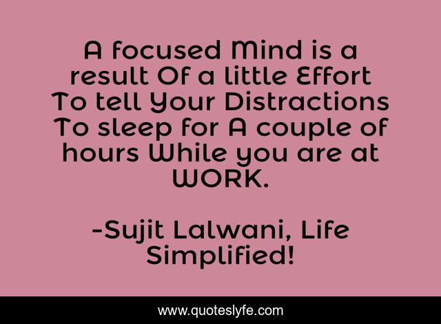 This page presents the quote "A focused Mind is a result Of a little Effort To tell Your Distractions To sleep for A couple of hours While you are at WORK.". Author of this quote is Sujit Lalwani, Life Simplified!. This quote is about life, hardwordk, motivation, inspirational, enthusiasm, effort,.