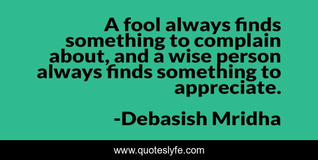 This page presents the quote "A fool always finds something to complain about, and a wise person always finds something to appreciate.". Author of this quote is Debasish Mridha. This quote is about miraboli, oscar-wilde, philosophy, debasish-mridha, a-wise-person, a-fool-complains, quotes, debasish-mridha-md, inspirational,.