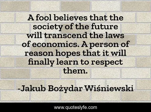 This page presents the quote "A fool believes that the society of the future will transcend the laws of economics. A person of reason hopes that it will finally learn to respect them.". Author of this quote is Jakub Bożydar Wiśniewski. This quote is about praxeology, economics, scarcity,.