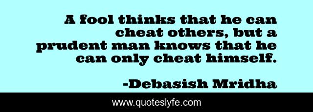 This page presents the quote "A fool thinks that he can cheat others, but a prudent man knows that he can only cheat himself.". Author of this quote is Debasish Mridha. This quote is about what-happens-when-you-cheat, only-cheat-yourself, philosophy, debasish-mridha, quotes, debasish-mridha-md, inspirational, a-prudent-man, enthusiasm,.