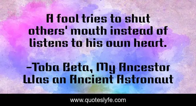 This page presents the quote "A fool tries to shut others' mouth instead of listens to his own heart.". Author of this quote is Toba Beta, My Ancestor Was an Ancient Astronaut. This quote is about fool, judgmental-heart, stupidity,.