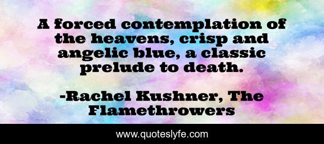 This page presents the quote "A forced contemplation of the heavens, crisp and angelic blue, a classic prelude to death.". Author of this quote is Rachel Kushner, The Flamethrowers. This quote is about prose, death,.