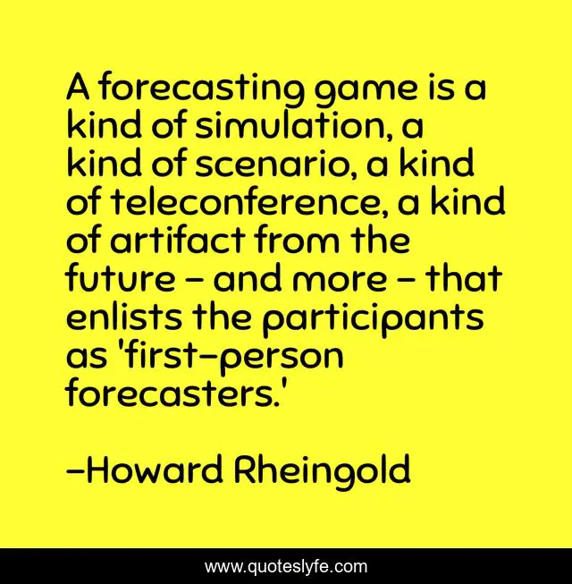 This page presents the quote "A forecasting game is a kind of simulation, a kind of scenario, a kind of teleconference, a kind of artifact from the future - and more - that enlists the participants as 'first-person forecasters.'". Author of this quote is Howard Rheingold. This quote is about game, kind, simulation,.