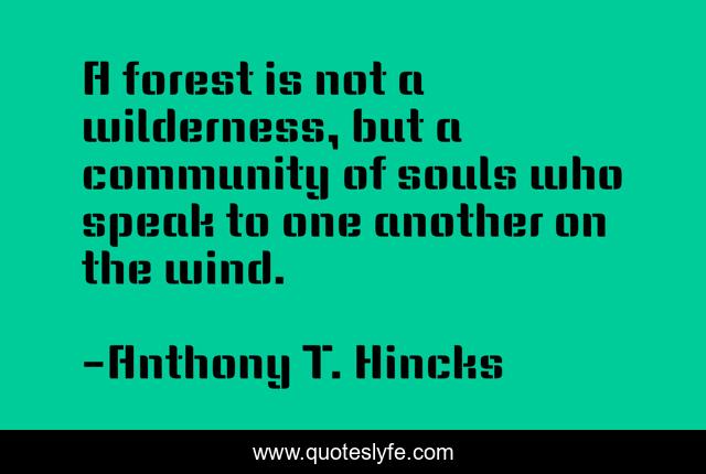 This page presents the quote "A forest is not a wilderness, but a community of souls who speak to one another on the wind.". Author of this quote is Anthony T. Hincks. This quote is about life, wilderness, philosophy, souls, community, forest, wind, speak,.