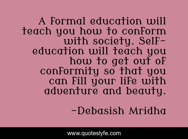 This page presents the quote "A formal education will teach you how to conform with society. Self-education will teach you how to get out of conformity so that you can fill your life with adventure and beauty.". Author of this quote is Debasish Mridha. This quote is about conform-with-society, formal-education, self-education, philosophy, debasish-mridha, quotes, fill-your-life, adventure, inspirational,.