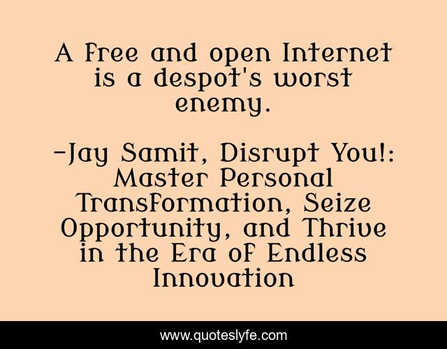 "Jay Samit, Disrupt You!: Master Personal Transformation, Seize Opportunity, and Thrive in the Era of Endless Innovation Quotes." Quoteslyfe.com, 2025. Fri. 05 Dec. 2025. <https://www.quoteslyfe.com/quote/A-free-and-open-Internet-is-a-106479>.