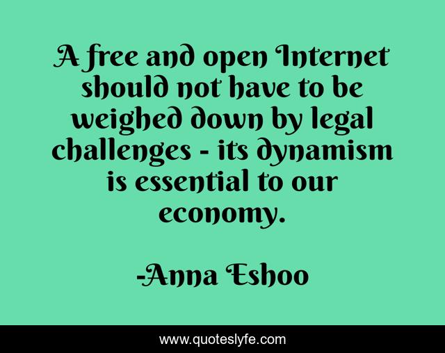 This page presents the quote "A free and open Internet should not have to be weighed down by legal challenges - its dynamism is essential to our economy.". Author of this quote is Anna Eshoo. This quote is about challenges, free, internet,.