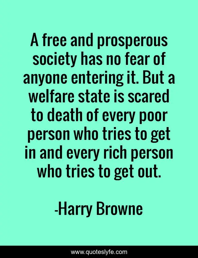 This page presents the quote "A free and prosperous society has no fear of anyone entering it. But a welfare state is scared to death of every poor person who tries to get in and every rich person who tries to get out.". Author of this quote is Harry Browne. This quote is about free-market, government, freedom, statism, liberty, state, socialism, libertarian, benefits,.