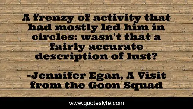 This page presents the quote "A frenzy of activity that had mostly led him in circles: wasn't that a fairly accurate description of lust?". Author of this quote is Jennifer Egan, A Visit from the Goon Squad. This quote is about lust, repetition,.