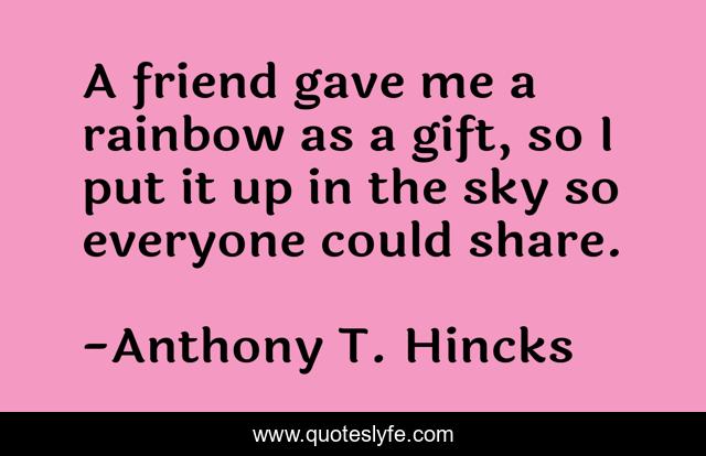 This page presents the quote "A friend gave me a rainbow as a gift, so I put it up in the sky so everyone could share.". Author of this quote is Anthony T. Hincks. This quote is about rainbow, everyone, in-the-sky, gift, share, philosophy, sky, friends, friend,.