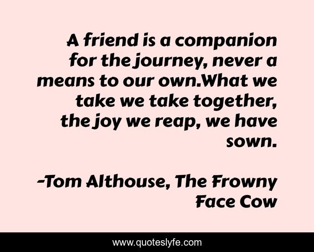 "Tom Althouse, The Frowny Face Cow Quotes." Quoteslyfe.com, 2025. Sun. 07 Dec. 2025. <https://www.quoteslyfe.com/quote/A-friend-is-a-companion-for-the-210571>.