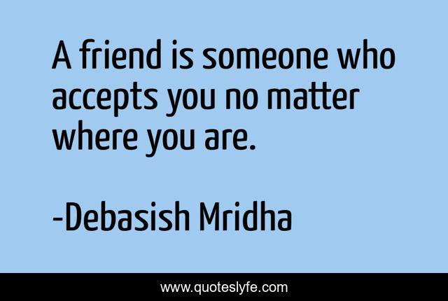 This page presents the quote "A friend is someone who accepts you no matter where you are.". Author of this quote is Debasish Mridha. This quote is about philosophy, debasish-mridha, unconditional-acceptance, quotes, inspirational, enthusiasm, friendship, debasish-mridha-m-d,.