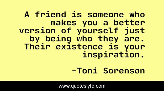 This page presents the quote "A friend is someone who makes you a better version of yourself just by being who they are. Their existence is your inspiration.". Author of this quote is Toni Sorenson. .