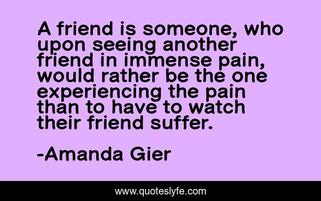 This page presents the quote "A friend is someone, who upon seeing another friend in immense pain, would rather be the one experiencing the pain than to have to watch their friend suffer.". Author of this quote is Amanda Gier. This quote is about friendship, suffering, pain,.