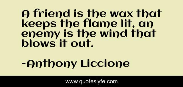 This page presents the quote "A friend is the wax that keeps the flame lit, an enemy is the wind that blows it out.". Author of this quote is Anthony Liccione. This quote is about love, gentle, candle, hate, trip, blow, curse, companionship, jealousy,.