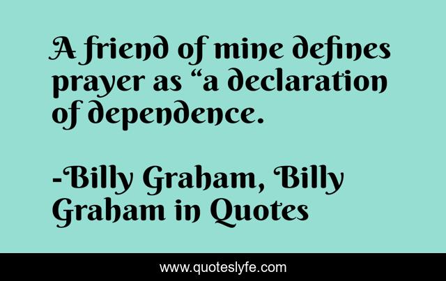 This page presents the quote "A friend of mine defines prayer as “a declaration of dependence.". Author of this quote is Billy Graham, Billy Graham in Quotes. This quote is about billy-graham, prayer,.