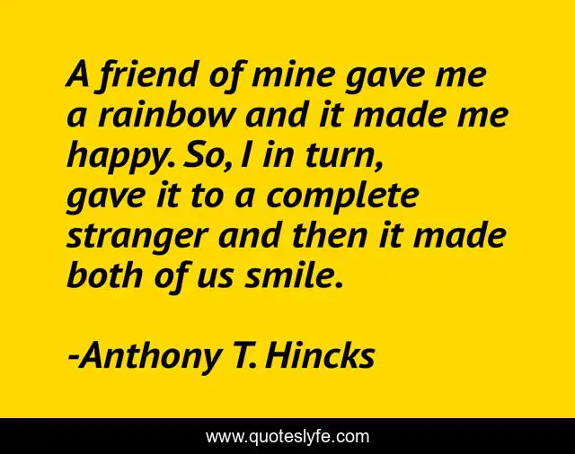 This page presents the quote "A friend of mine gave me a rainbow and it made me happy. So, I in turn, gave it to a complete stranger and then it made both of us smile.". Author of this quote is Anthony T. Hincks. This quote is about rainbow, complete, stranger, give, giving, rainbows, philosophy, complete-stranger, friend,.