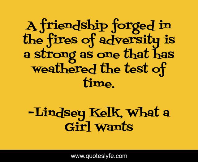 This page presents the quote "A friendship forged in the fires of adversity is a strong as one that has weathered the test of time.". Author of this quote is Lindsey Kelk, What a Girl Wants. This quote is about fashion, love, photographer, milan, passion, adventure, girl, friendship, affection,.