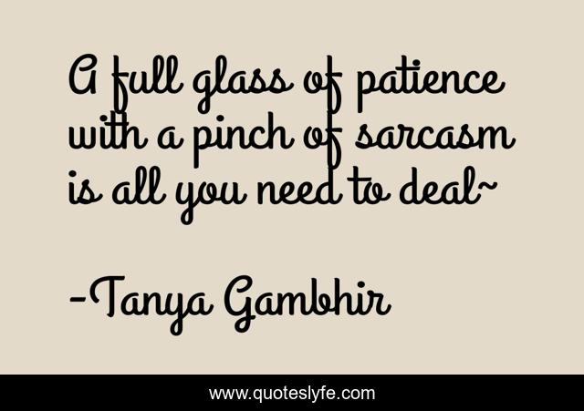 This page presents the quote "A full glass of patience with a pinch of sarcasm is all you need to deal~". Author of this quote is Tanya Gambhir. This quote is about life-philosophy, humor, sarcastic-humor, sarcasm,.