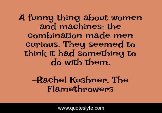 This page presents the quote "A funny thing about women and machines: the combination made men curious. They seemed to think it had something to do with them.". Author of this quote is Rachel Kushner, The Flamethrowers. This quote is about men, machines, women,.