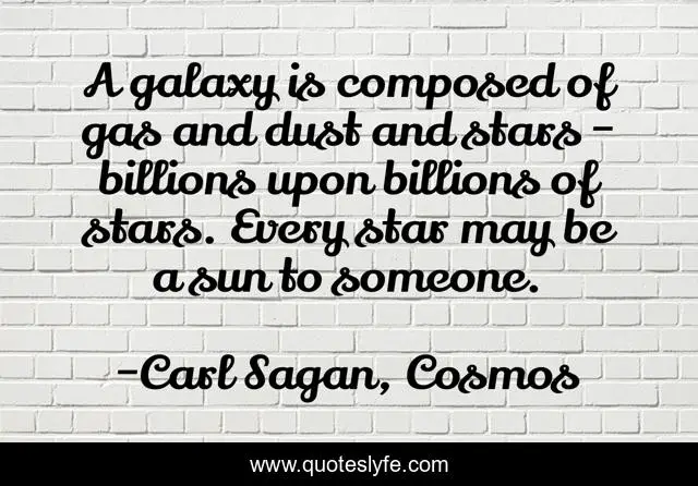 This page presents the quote "A galaxy is composed of gas and dust and stars - billions upon billions of stars. Every star may be a sun to someone.". Author of this quote is Carl Sagan, Cosmos. This quote is about imagination, unknown,.