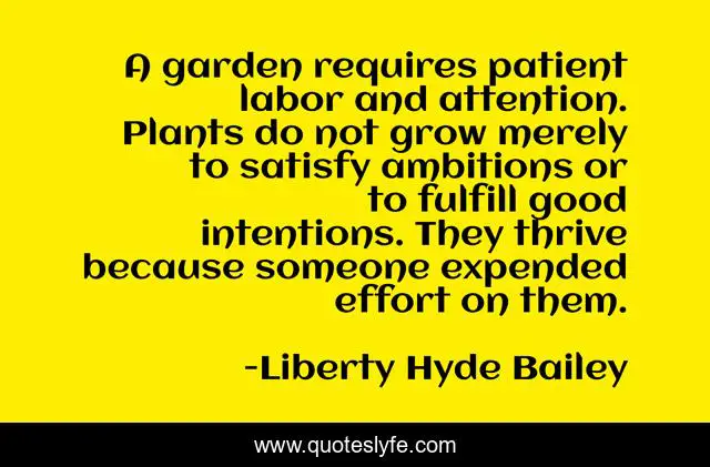 This page presents the quote "A garden requires patient labor and attention. Plants do not grow merely to satisfy ambitions or to fulfill good intentions. They thrive because someone expended effort on them.". Author of this quote is Liberty Hyde Bailey. This quote is about gardening, effort, garden,.