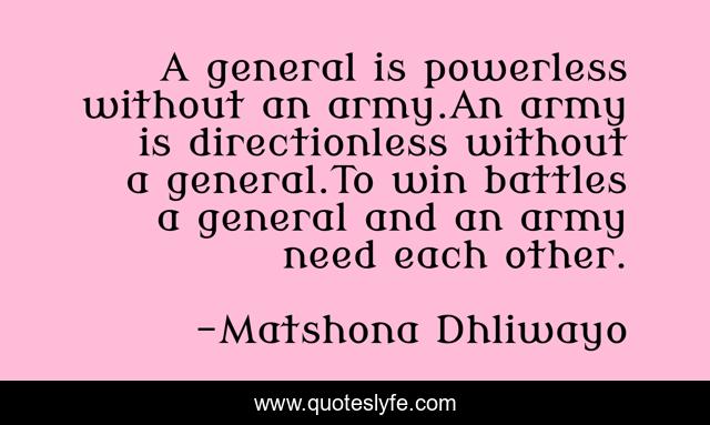 "Matshona Dhliwayo Quotes." Quoteslyfe.com, 2025. Fri. 05 Dec. 2025. <https://www.quoteslyfe.com/quote/A-general-is-powerless-without-an-army-257957>.