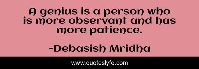 This page presents the quote "A genius is a person who is more observant and has more patience.". Author of this quote is Debasish Mridha. This quote is about miraboli, oscar-wilde, be-patient, philosophy, debasish-mridha, tagore, what-is-a-genius, quotes, debasish-mridha-md,.