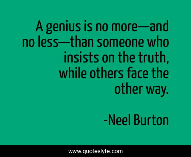 This page presents the quote "A genius is no more—and no less—than someone who insists on the truth, while others face the other way.". Author of this quote is Neel Burton. This quote is about genius, philosophy, self-deception, truth,.