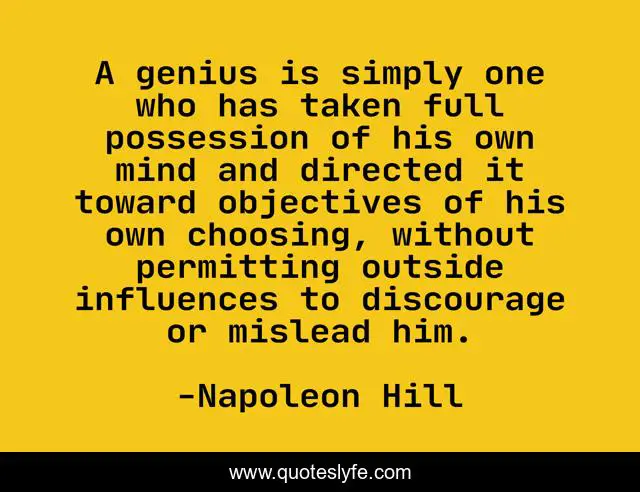 This page presents the quote "A genius is simply one who has taken full possession of his own mind and directed it toward objectives of his own choosing, without permitting outside influences to discourage or mislead him.". Author of this quote is Napoleon Hill. This quote is about enthusiasm, inspirational,.